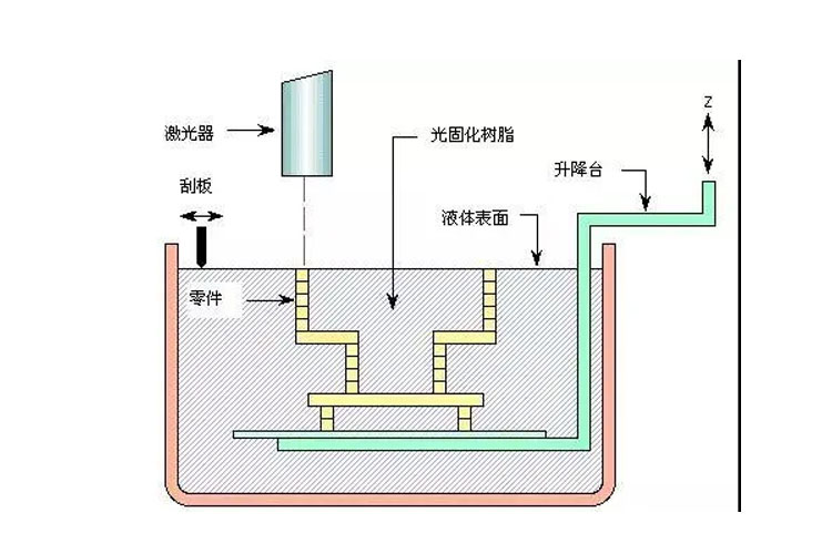 打印之前在樹脂槽中盛滿液態(tài)光敏樹脂,可升降工作臺處于液面下一個截面層厚的高度,聚焦后的激光束在計算機控制下沿液面進行掃描,被掃描的區域樹脂固化,從而得到該截面的一層樹脂薄片;升降工作臺下降一個層厚距離,液體樹脂再次暴露在光線下,再次掃描固化,如此重復,直到整個產品成型;升降臺升出液體樹脂表面,取出工件,進行相關后處理,通過強光、電鍍、噴漆或著色等處理得到需要的最終產品。